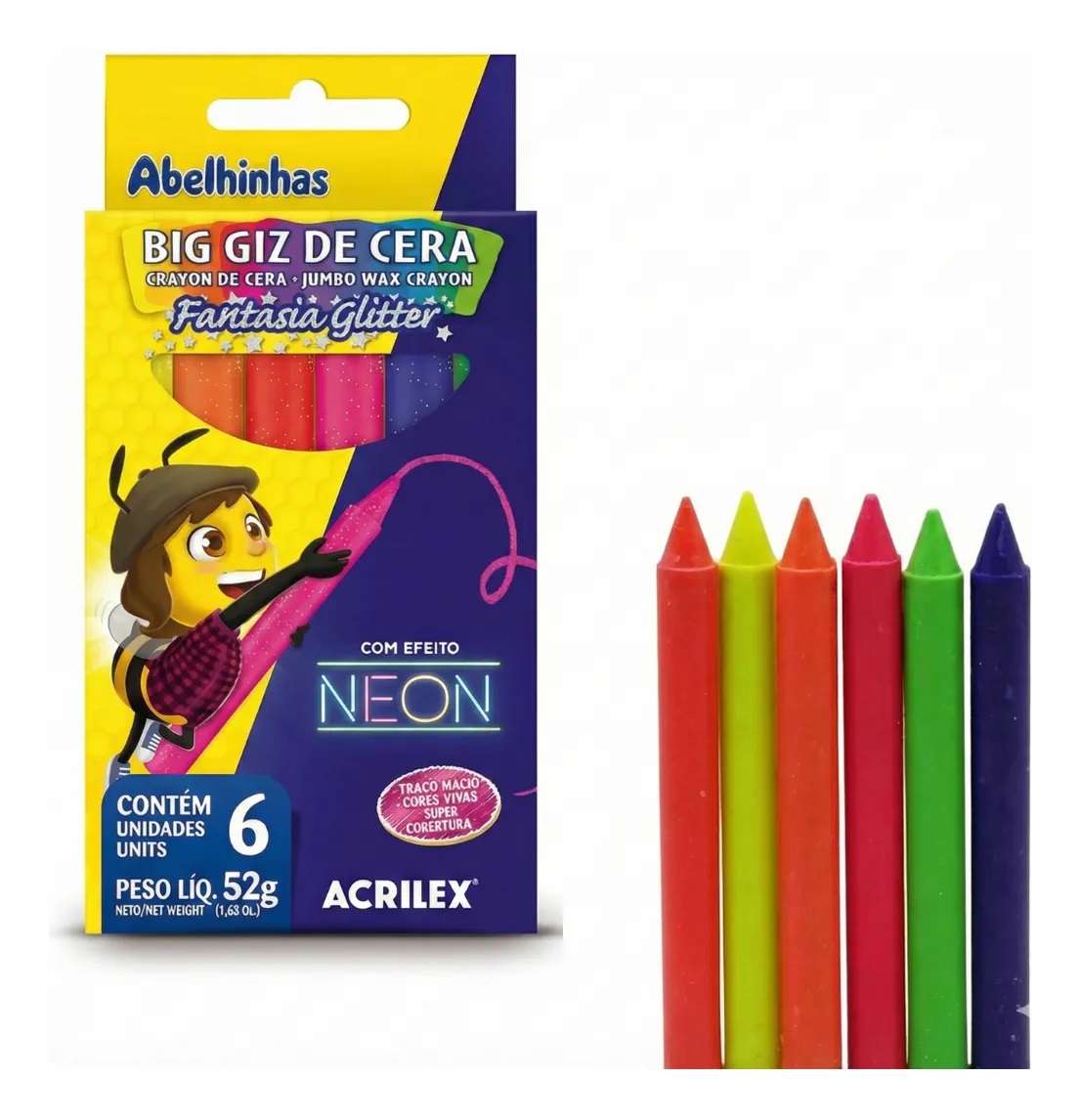 Início→Material Escolar→Giz de Cera→BIG Giz de Cera Fantasia Glitter – 6 Cores Efeito Neon – ACRILEX