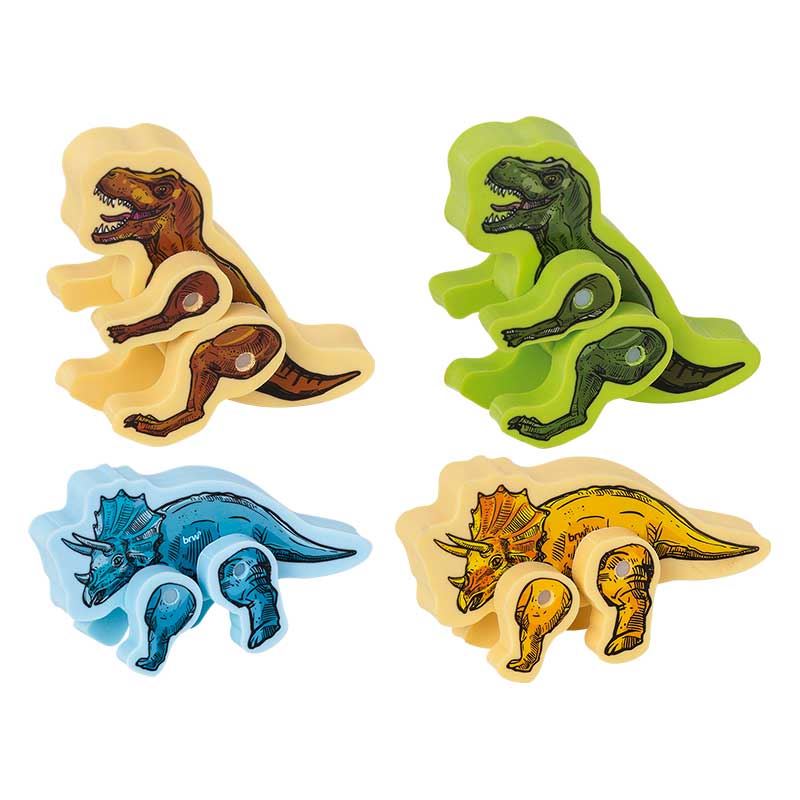 Marca: BRW Modelo: BO0421 Linha: Raptors Formatos sortidos de dinossauros Material macio e resistente Apaga com eficiência e sem borrar Ideal para uso escolar ou colecionável
