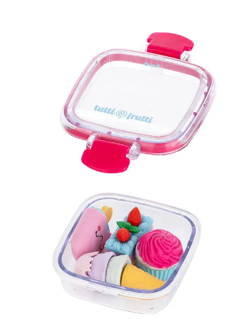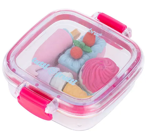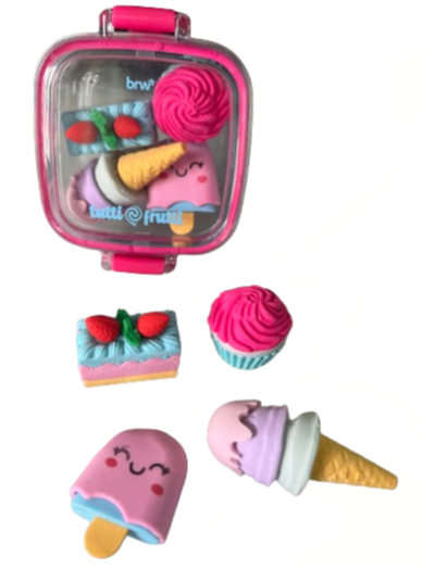 Leve a diversão para a sala de aula com o conjunto de 4 mini borrachas BRW Tutti-Frutti. Com formatos de picolé,sorvete,bolo e cupcake,elas são perfeitas para personalizar seu material escolar. Além disso,as peças se encaixam uma nas outras e vêm em uma embalagem tipo lancheira,ideal para organizar e transportar com estilo.
