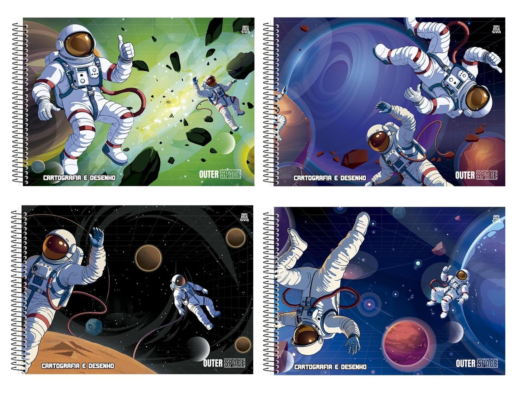 - Capa dura laminada brilhante com estampas exclusivas de astronautas no espaço.