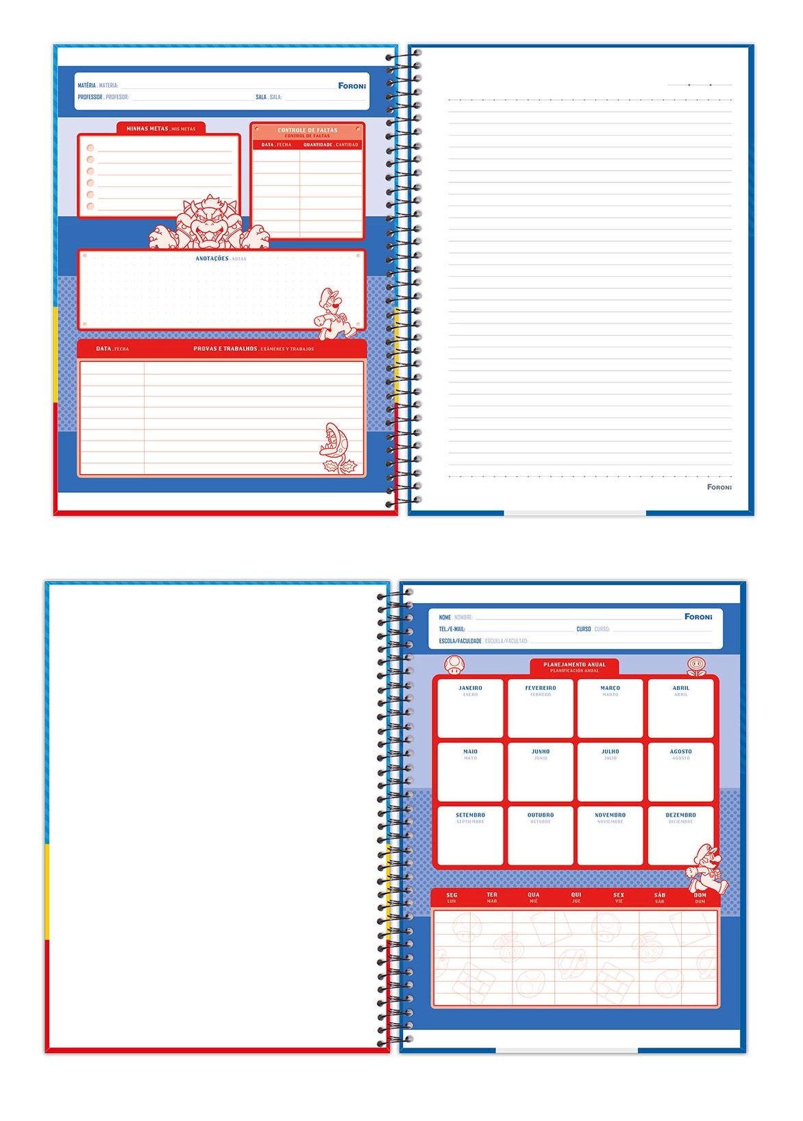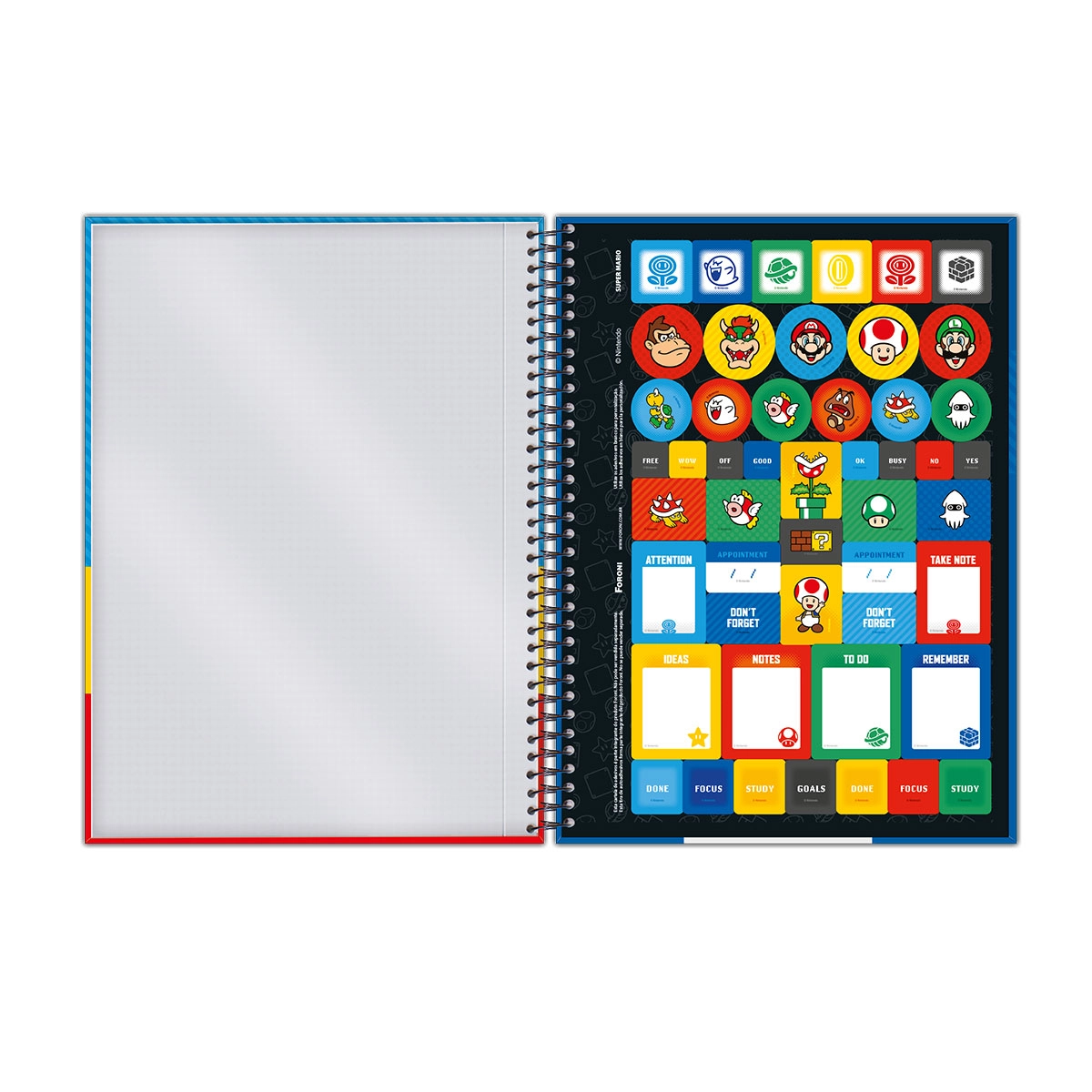 Entre no mundo aventureiro de Mario e seus amigos com a coleção Super Mario Bros da Foroni. Combinando funcionalidade com o divertido universo dos clássicos jogos de videogame, este caderno é uma adição essencial para fãs de todas as idades que desejam incorporar um pouco da magia do mundo de Mario ao seu cotidiano acadêmico ou profissional.