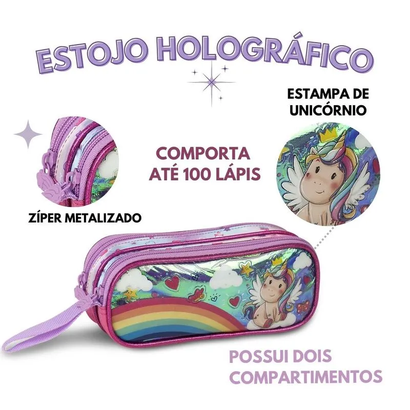 Este estojo duplo de unicórnio é perfeita para adicionar um toque de magia ao dia a dia escolar. Com um design deslumbrante e estampa holográfica de unicórnio, ele promete ser o companheiro ideal para pequenos aventureiros. O material de Poliéster, combinado com o PVC do painel frontal, não só dá um toque de sofisticação, mas também oferece resistência e durabilidade