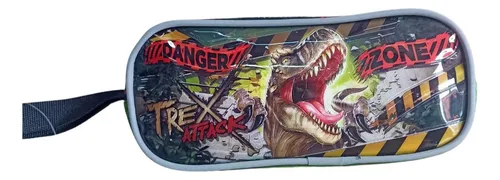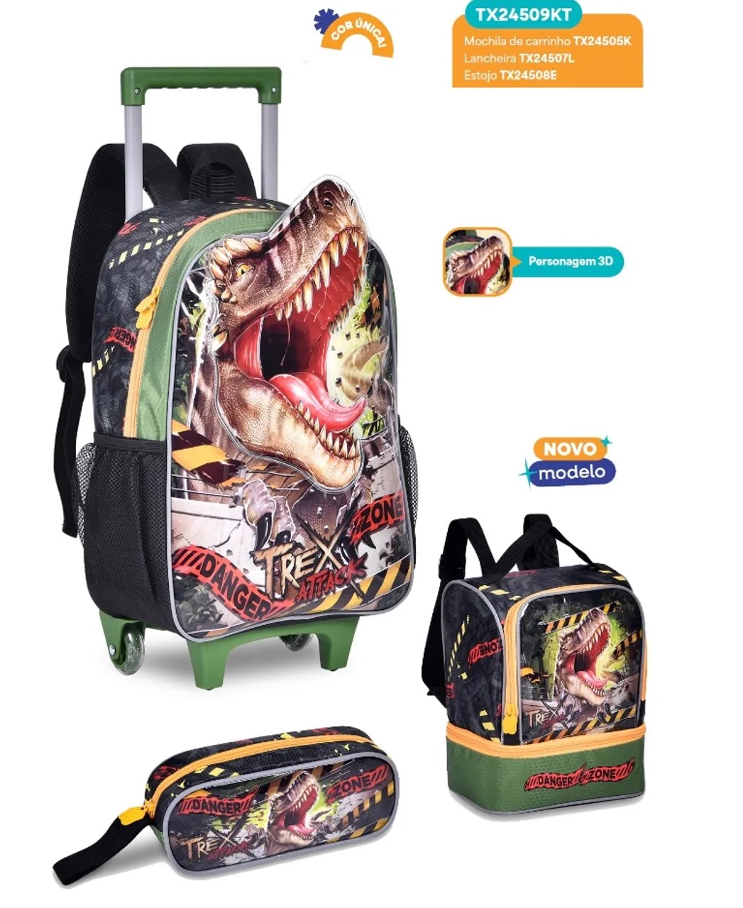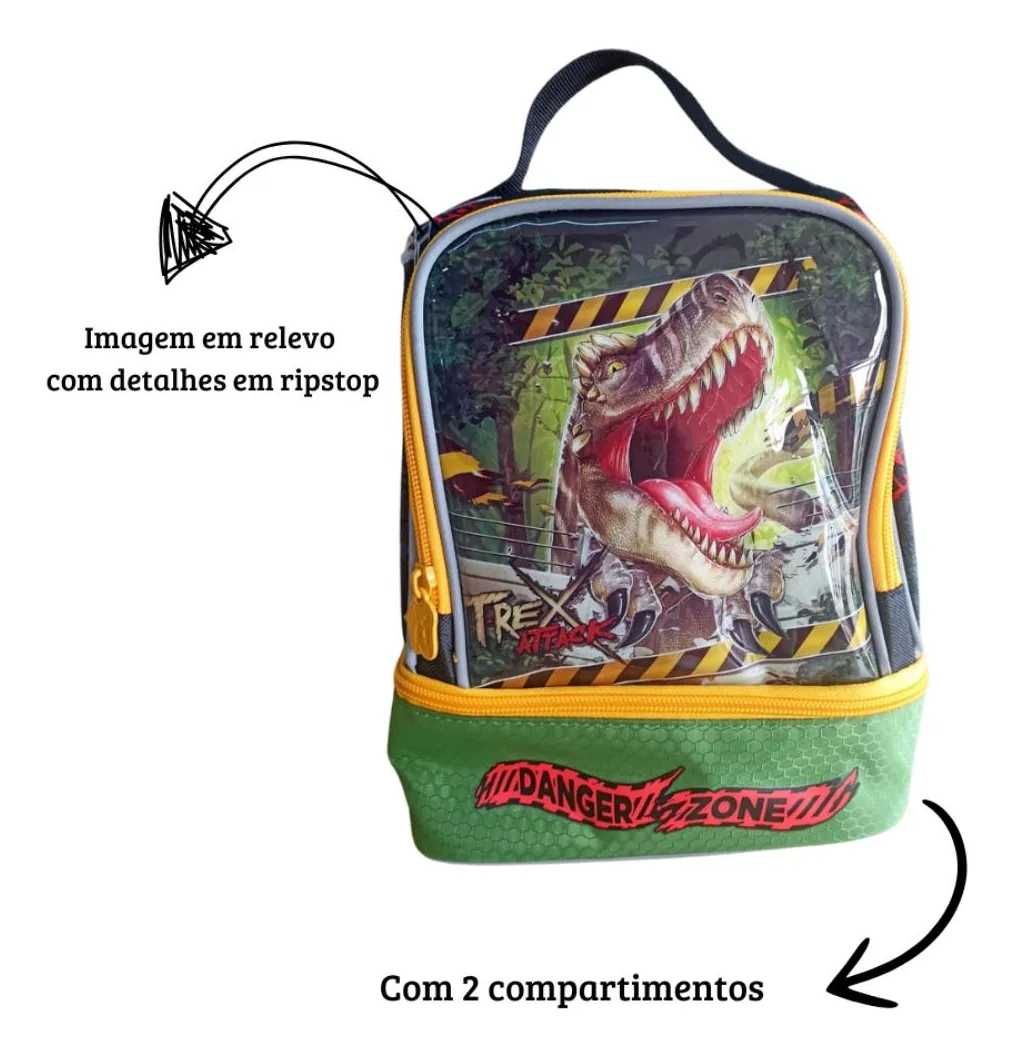 Mochila Carrinho Grande + Lancheira Térmica e Estojo Duplo T-Rex Attack Clio