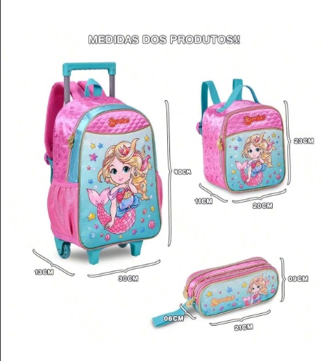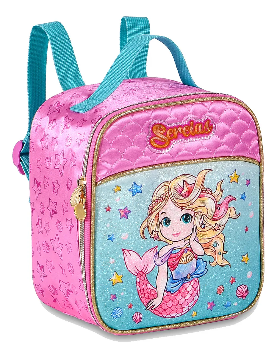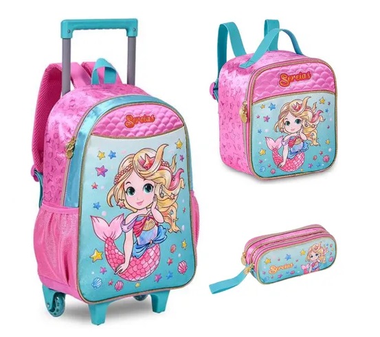 Mochila Carrinho + Lancheira e Estojo Duplo Sereia Rosa Clio Style