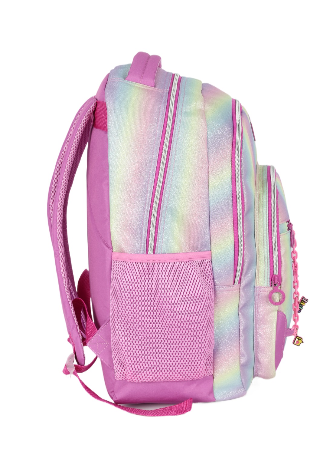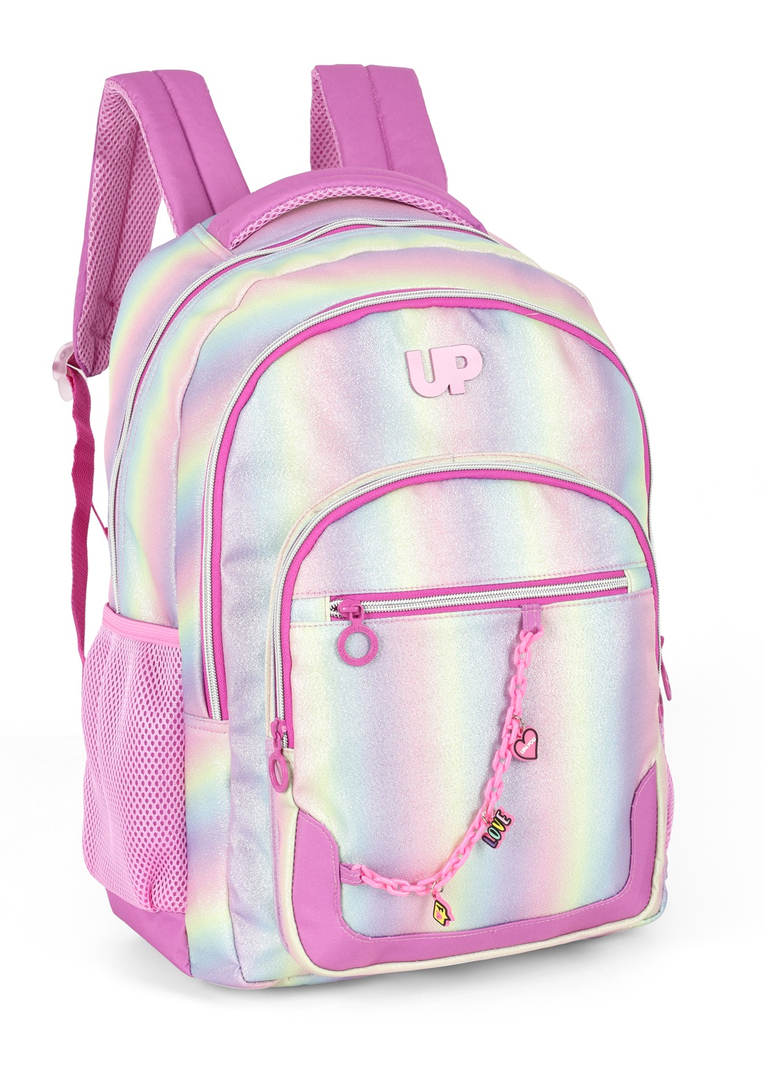 A Mochila Luxcel UP4You Rainbow traz alegria e praticidade para o dia a dia com seu design vibrante inspirado no arco-íris e detalhes de glitter na parte frontal. Parte da linha UP4You, este modelo conta com quatro bolsos espaçosos que facilitam a organização de materiais, gadgets e itens pessoais, enquanto o suporte lateral para garrafas oferece praticidade extra. A combinação de cores intensas e glitter adiciona um toque de brilho e estilo, ideal para acompanhar a rotina escolar ou atividades cotidianas com muito charme.