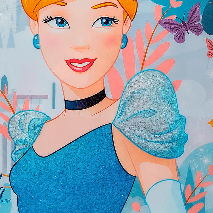 A mochila da Cinderella é feita de poliéster resistente, com frente em PVC + glitter localizado e puxador do zíper personalizado. Possui um compartimento amplo, hastes com trava e rodinhas decoradas com glitter. As cores de sua composição combinam com o vestido da personagem. Ideal para transportar os pertences com estilo!