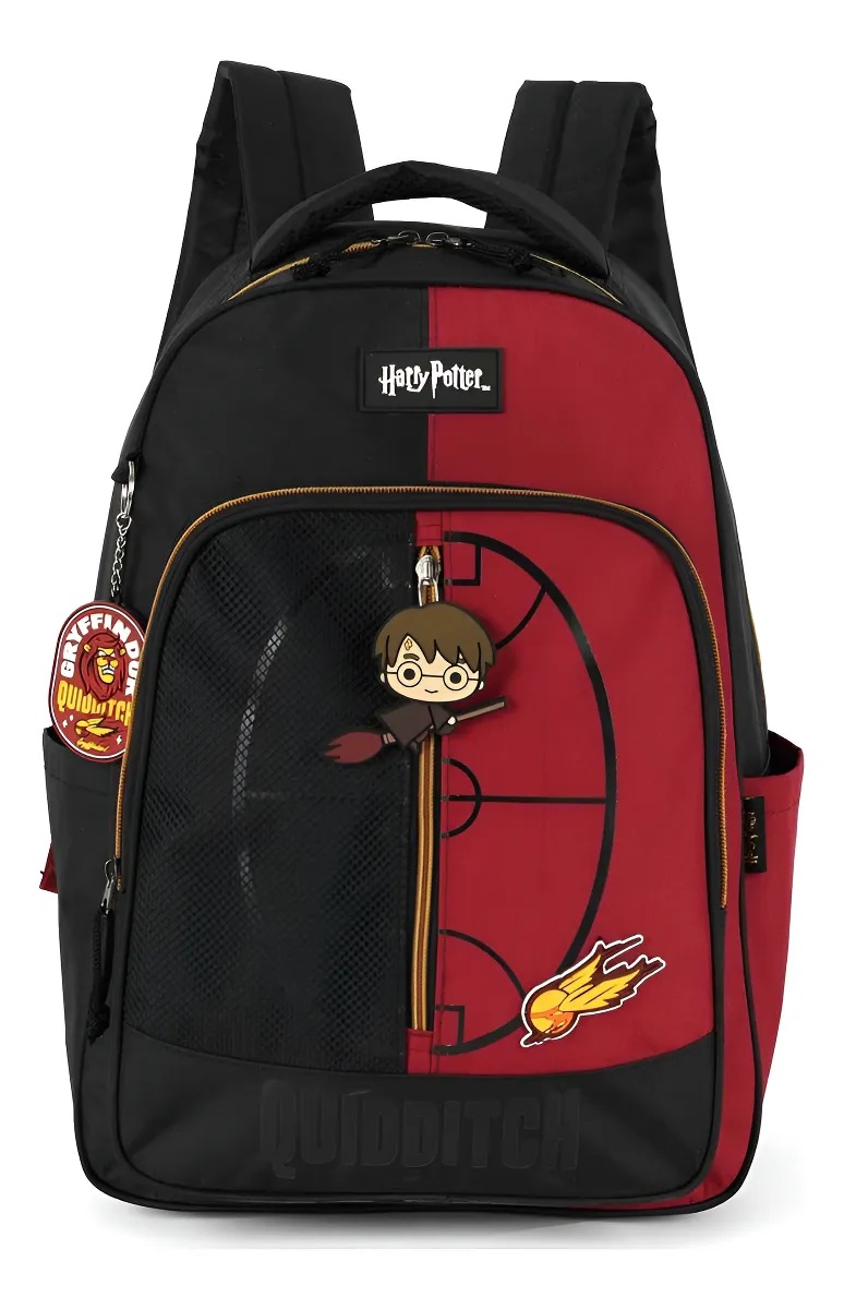 A Mochila Harry Potter é perfeita para fãs do bruxinho mais famoso do mundo, disponível em duas opções de estampa: Hogwarts Express, com o icônico muro de tijolos da Plataforma 9¾ e detalhes dourados, e Quadribol, trazendo o campo de jogo e Harry voando em sua vassoura.