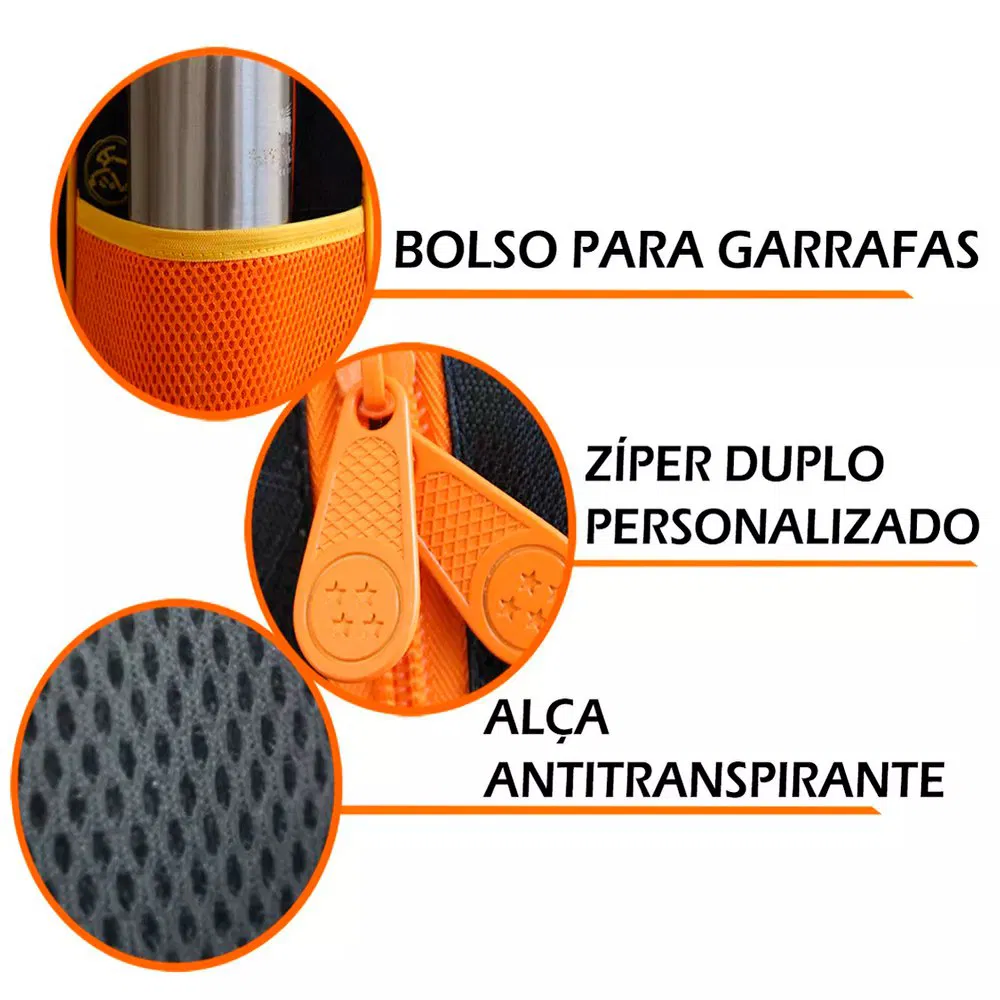 Na lateral, a mochila possui dois bolsos em mesh (redinha) para guardar a garrafinha de água, suco ou refrigerante.