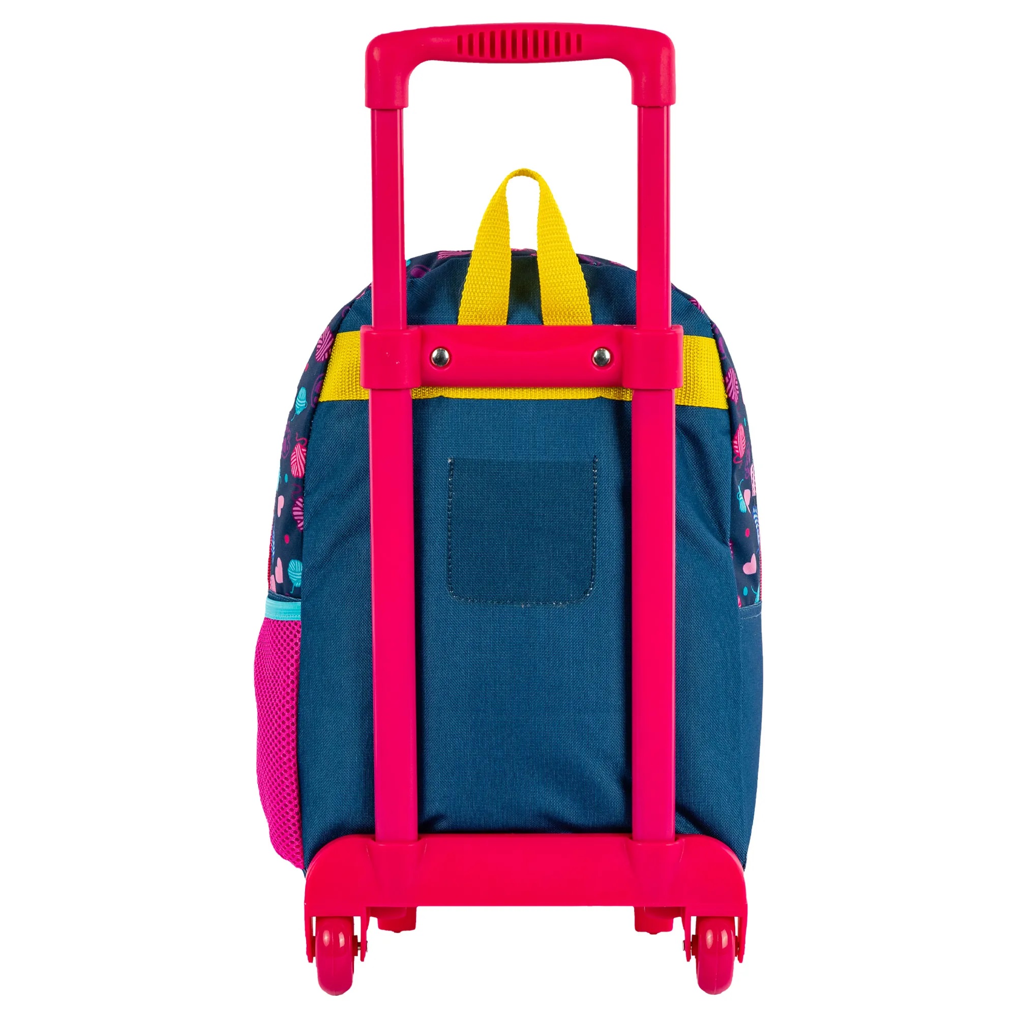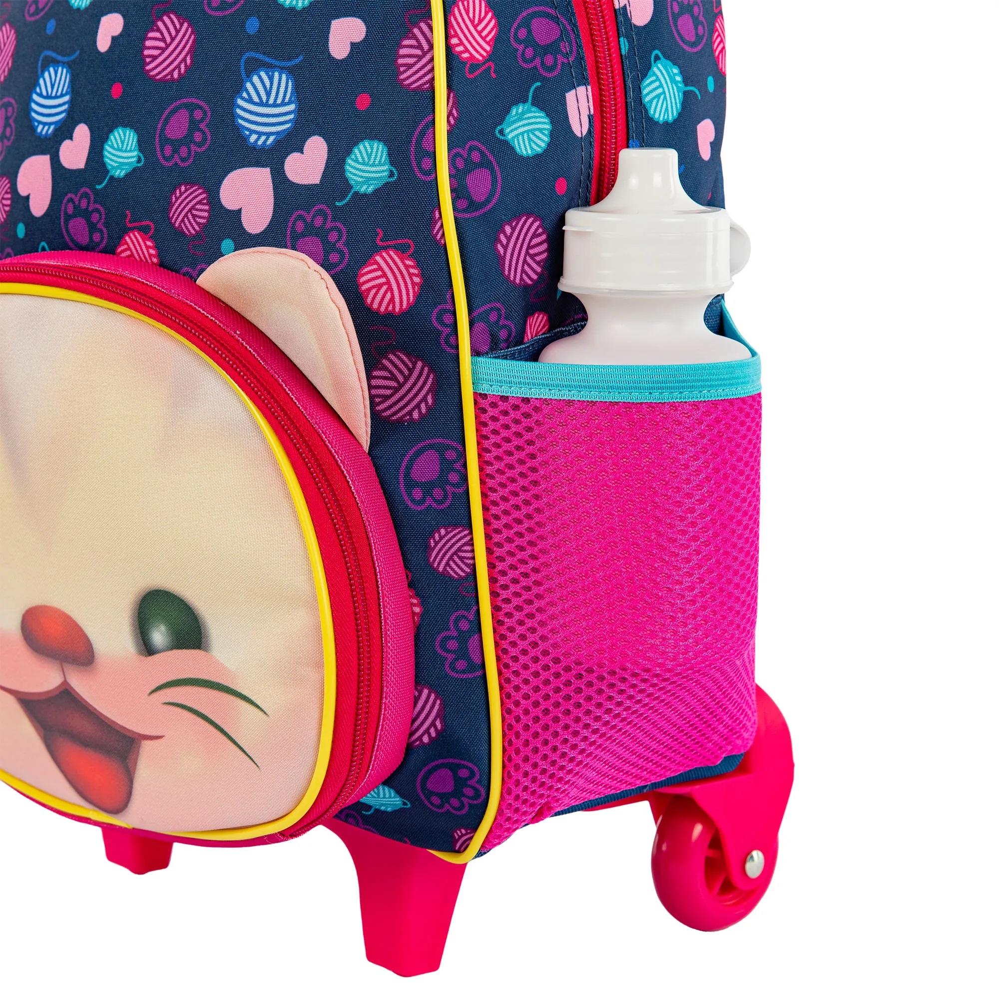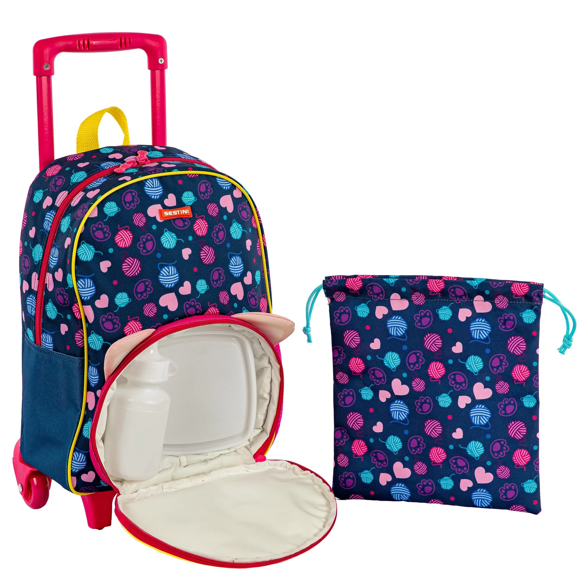 Além de ser muito fofa, a mochila de carrinho Sestini Kids Cat é a solução completa dos pequenos na escola: ela é 2 em 1 e já vem com um bolso para ser usada como lancheira! O compartimento tem revestimento resistente à líquidos e fácil de limpar e acompanha garrafinha, potinho e um saco de nylon. No bolso central, cabe todo o material escolar, inclusive a pasta. A versão com carrinho tem 2 rodinhas e pés de apoio.